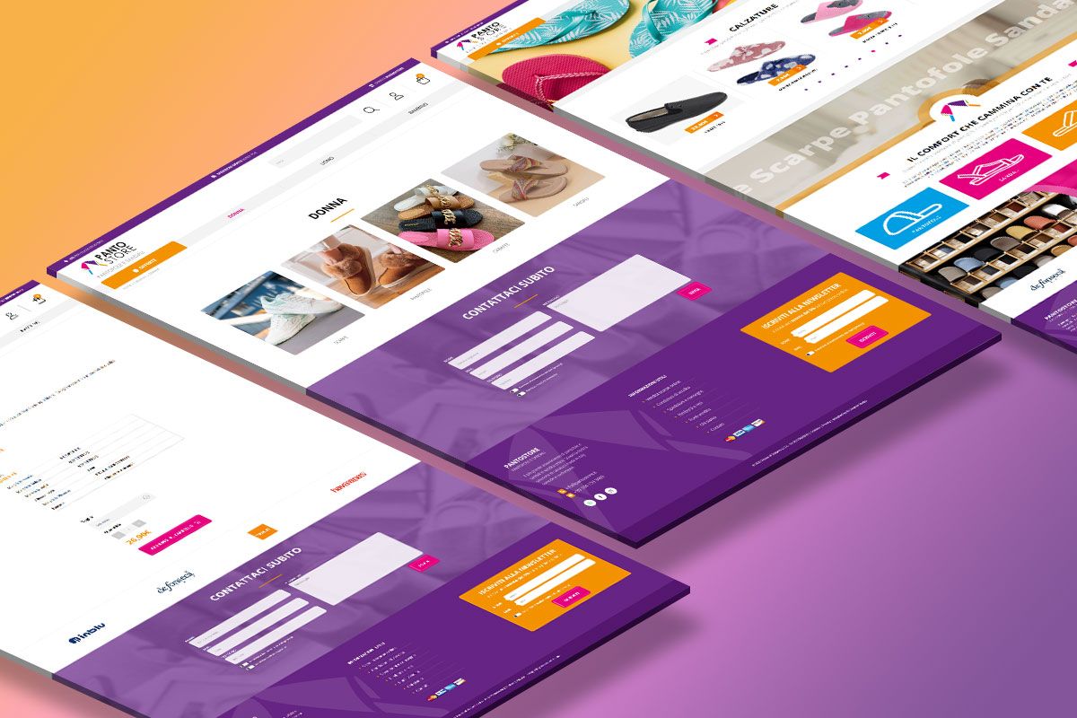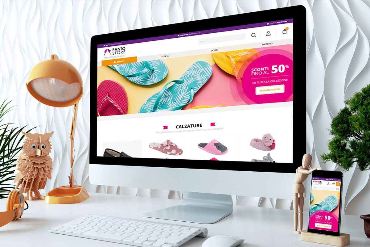 La realizzazione grafica di Pantostore.it punta su un layout chiaro e moderno, con una home page che mette in evidenza le offerte principali, sconti e una selezione di prodotti in vetrina per catturare immediatamente l’attenzione dei visitatori. La struttura grafica è pensata per mettere in risalto le categorie di prodotti — come pantofole, sandali, ciabatte e scarpe — attraverso fotografie di alta qualità e testi descrittivi accattivanti che favoriscono la conversione degli utenti in clienti.